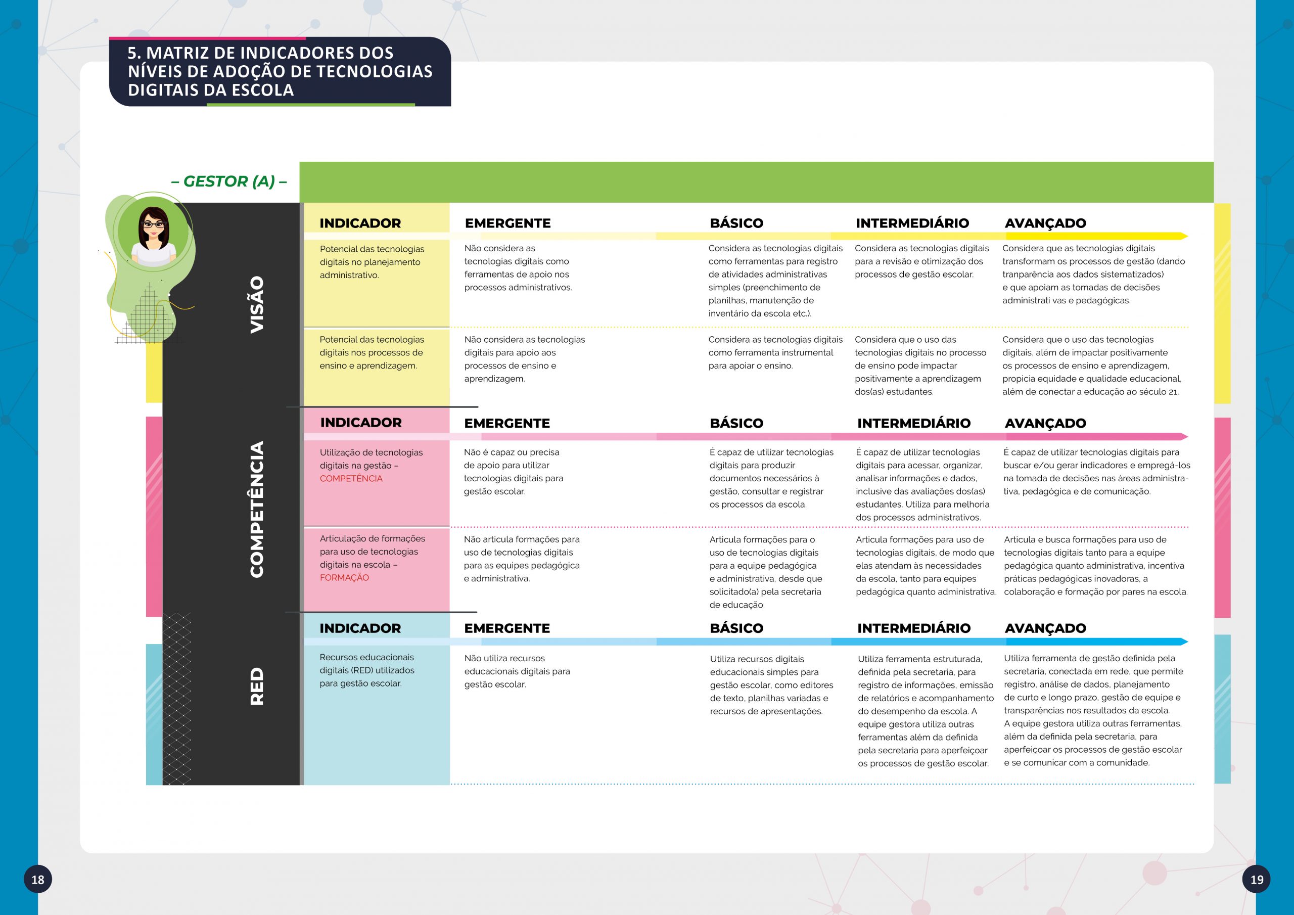 Eles estão sintetizados na “Matriz de indicadores dos níveis de adoção de tecnologias digitais da escola” e mostram como se dá o avanço gradual em cada uma das quatro dimensões da Escola Conectada (visão, competências, RED e infraestrutura) nessa escala. A mesma análise pode ser feita em relação à escola, aos gestores e gestoras e, finalmente, aos/às docentes.